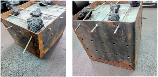 Loading of boxes was carried out through the middle hatch after the release of the batch from the coke and machine hoppers of the coal loading car so that the boxes with the batch were located at a level of approximately 2.5 m from the bottom of the coking chamber, that is, in the zone of optimal temperature conditions. Four boxes were loaded into each chamber according to the number of experimental batches. Experimental coking was carried out under the thermal regime, the parameters of which are presented in Table 3.