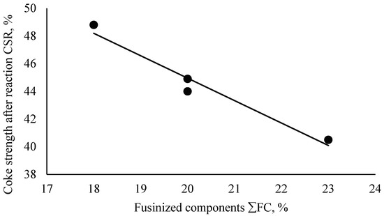 Dependence of the coke strength after reaction and the content of fusinized components.