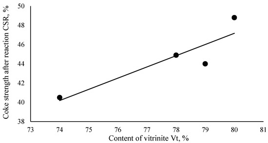 The influence of coal raw material properties on the quality characteristics of coke is illustrated by the graphical dependencies represented in Figure 2, Figure 3, Figure 4, Figure 5 and Figure 6.