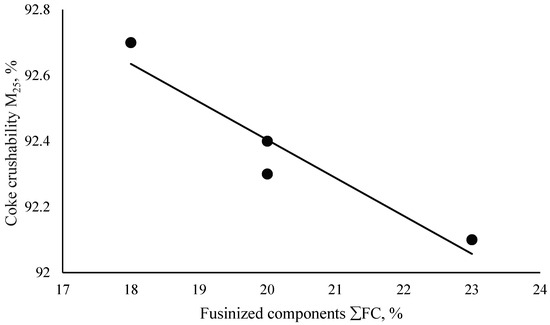 Dependence of the coke crushability M25 and the content of fusinized components.