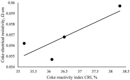 Specific resistivity is a measure of the temperature effect during the process of thermal destruction of coal and coke conversion. Under the influence of temperature, structural changes in the organic matrix of coal transform its physical properties and therefore its electrical resistivity [44]. Depending on the final temperature of the process, the specific electrical resistivity decreases as the temperature increases. Since determining electrical resistivity is simpler, does not require reagents, and takes significantly less time than measuring reactivity, it can be considered an operational method for determining coke’s structural characteristics and readiness [45,46]. Therefore, the specific electrical resistance index can characterize the degree of coke readiness.