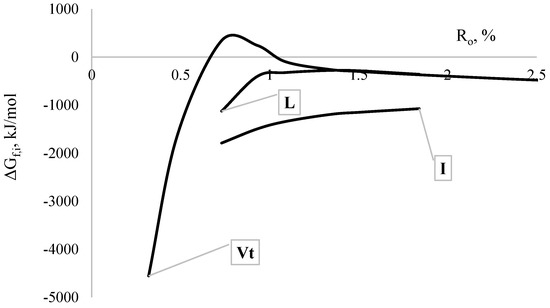 The thermodynamic parameters for the coal macerals were taken from [50]; these values are also visualized in Figure 8, where ΔGf,i is presented as a function of the mean reflection coefficient (Ro). Results of the calculations are presented in Table 15.