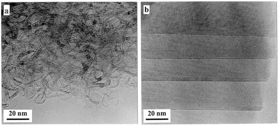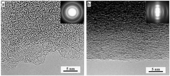 TEM images of (a) sucrose carbon and (b) anthracene carbon following heat treatment at 2300 °C. Reproduced with permission from Taylor & Francis, 2005 [].