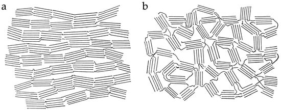 Franklin described her studies of graphitisation in a paper for the Proceedings of the Royal Society of London, published in 1951 []. She proposed models for the two classes of material she had identified; these are shown in Figure 4. The basic units in these structures are small graphitic domains joined together by crosslinks. In the model of graphitising carbon, the graphitic domains are approximately parallel to each other, and the crosslinks are assumed to be weak as in Figure 4a. Such a structure would be relatively easy to transform into crystalline graphite. By contrast, the structure of non-graphitising carbons consists of randomly oriented domains as in Figure 4b, and the cross-links are strong enough to impede movement of the layers into a parallel arrangement. While these models do not represent a full description of the distinction between graphitising and non-graphitising carbons, since the nature of the cross-links is not explained, they have in fact stood the test of time rather better than some of the other models that have been proposed for NGCs.