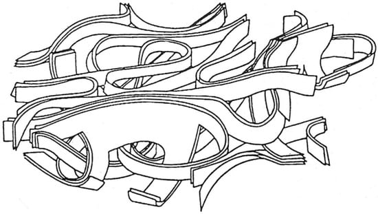 As noted above, in the mid 1970s, Ban, Crawford and Marsh put forward ribbon-like models for non-graphitising carbons, based on their TEM studies []. One of their models, intended to represent a PVDC-derived carbon heated at 1950 °C, is shown in Figure 5. A similar model for the structure of glassy carbon had been proposed in 1971 by Jenkins and Kawamura []. However, models of this kind have serious deficiencies. The models assume a structure in which twisted and curved and graphite ribbons, typically made up of 2–3 layers, enclose randomly shaped pores. A problem with this is that thin graphite sheets of this kind are known to be flexible, so that the structure would tend to collapse at high temperatures, in order to reduce surface energy. There are many examples in the literature of tightly folded graphene and graphite sheets in carbons that have been exposed to high temperatures, e.g., []. Thus, structures like the one shown in Figure 5 would be unlikely to be stable at very high temperatures.