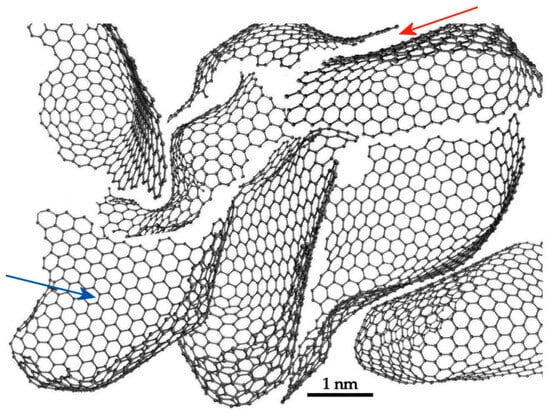 Model of activated carbon made up of fullerene-related fragments. Arrows indicate two different kinds of pores: blue arrow indicates randomly-shaped, three-dimensional pore, red arrow indicates slit-like pore. Adapted with permission from Royal Society, 2022 [].