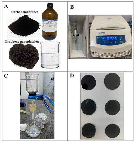 In this study, CNTs and GNPs were used to fabricate hybrid BPs. The preparation process was designed to integrate these nanomaterials, leveraging their complementary properties while overcoming the limitations of single-material BPs. Hybrid BPs provide greater control over porosity and density, making them highly suitable for applications in filtration, sensors, and energy storage. The synergistic combination of CNTs and GNPs also reduces aggregation and improves dispersion, resulting in more homogeneous and well-structured materials [20,21,22,23,24,25].