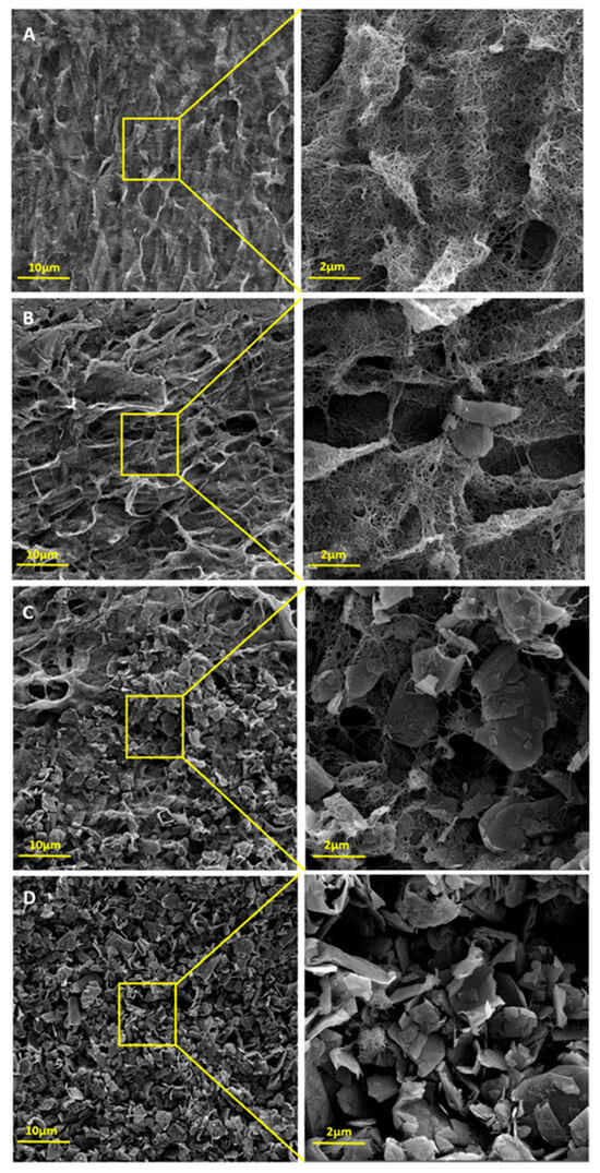 Figure 4 presents the FEG-SEM images of hybrids BPs with GNP/CNT compositions of 0/100, 25/75, 50/50, and 95/5. The morphologies of CNT and GNP are clearly distinguishable. In the CNT-based BP (Figure 4A), only entangled nanotube cylinders are visible, showing a more uniform morphology with greater interaction among the CNTs. In Figure 4B, small amounts of GNP are visible within the CNT entanglements. While GNPs interacted with CNTs and contributed to hybrid BP formation, they made the BP more fragile and less uniform, likely due to their larger dimensions. These observations became even more evident when attempting to remove the produced BP from the filter, as manual handling alone caused its fragmentation. As the GNP content increases, more GNP sheets and fewer entangled CNTs are visible, with this trend most evident in Figure 4D, which has the highest GNP content.