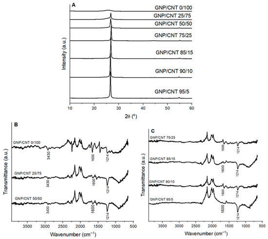 (A) XRD patterns, (B,C) FT-IR spectra of GNP/CNT 0/100 BP and hybrid GNP/CNT BPs with different GNP and CNT contents.