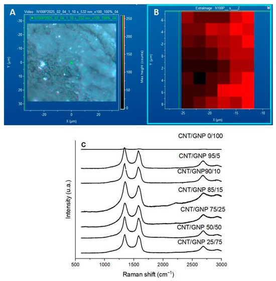 (A) Micrograph and (B) mapping of the CNT/GNP 50/50 sample, and (C) Raman spectra for CNT/GNP 0/100 BP and hybrid CNT/GNP BPs with different GNP and CNT contents.