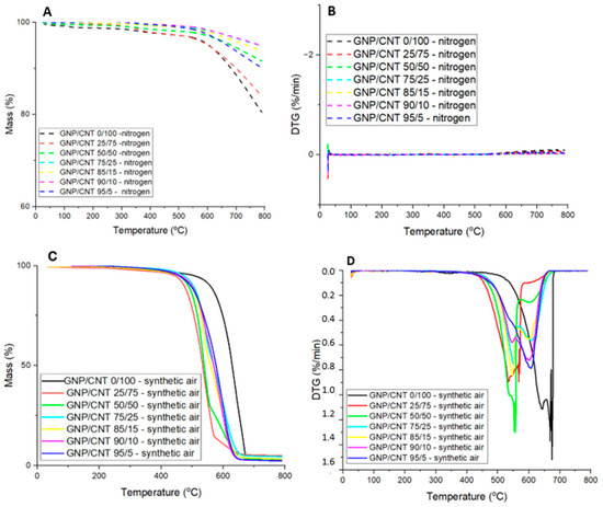 (A) TGA curves in nitrogen, (B) DTG curves in nitrogen, (C) TGA curves in synthetic air atmosphere, and (D) DTG curves in synthetic air atmosphere for GNP/CNT 0/100 BP and hybrid GNP/CNT BPs with different GNP and CNT contents.