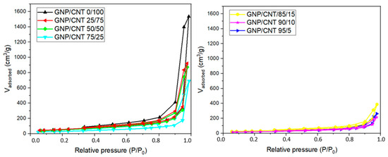 Information on the surface area and total pore volume of the BPs was obtained through the analysis of nitrogen adsorption/desorption isotherms. Figure 8 presents the nitrogen adsorption/desorption isotherms obtained for all the BPs studied. All the isotherms can be classified as type II, characteristic of non-porous materials, and type IV, exhibiting hysteresis at higher relative pressures, according to IUPAC [79]. Above a relative pressure of 0.9, a sharp increase in the adsorbed amount occurs, accompanied by a well-defined hysteresis loop, which is associated with the presence of mesoporosity. The isotherm for the GNP/CNT 0/100 BP closely resembles those previously reported for other BPs prepared using the same type of CNT and low molecular weight dispersants [80]. The GNP/CNT 0/100 BP exhibits a higher amount of nitrogen adsorption at a relative pressure of 0.8, indicating a more prominent presence of mesoporosity compared to the hybrid GNP/CNT BPs. This enhanced mesoporosity can be attributed to the blocking effect of the CNT mesoporosity by the GNP. These results suggest notable differences in the internal morphologies between the hybrid GNP/CNT BPs and the CNT-based BP. Additionally, the layer-like structure of the GNPs creates tortuous and complex pathways for gas molecule diffusion, which can be associated with the reduction in the measured permeated volume as the GNP content increased [81].