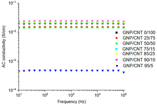 Electrical characterization was conducted via IS measurements using a Solartron SI 1260 Impedance/Gain-phase Analyzer (Solartron Analytical, AMETEK, Farnborough, Hampshire, UK). A 0.5 V alternating current was applied over a frequency range of 1–105 Hz. To ensure electrical contact, a thin layer of gold/palladium alloy was deposited on both sides of the samples using a metallizer (Bal-tec, MED020, Bal-tec, MED020, Bal-Tec AG, Balzers, Liechtenstein), forming a metal-composite-metal structure. The AC electrical conductivity (σAC) of the materials was calculated based on the sample thickness (l), contact area (A), and impedance modulus (|Z|), as described in Equation (3).