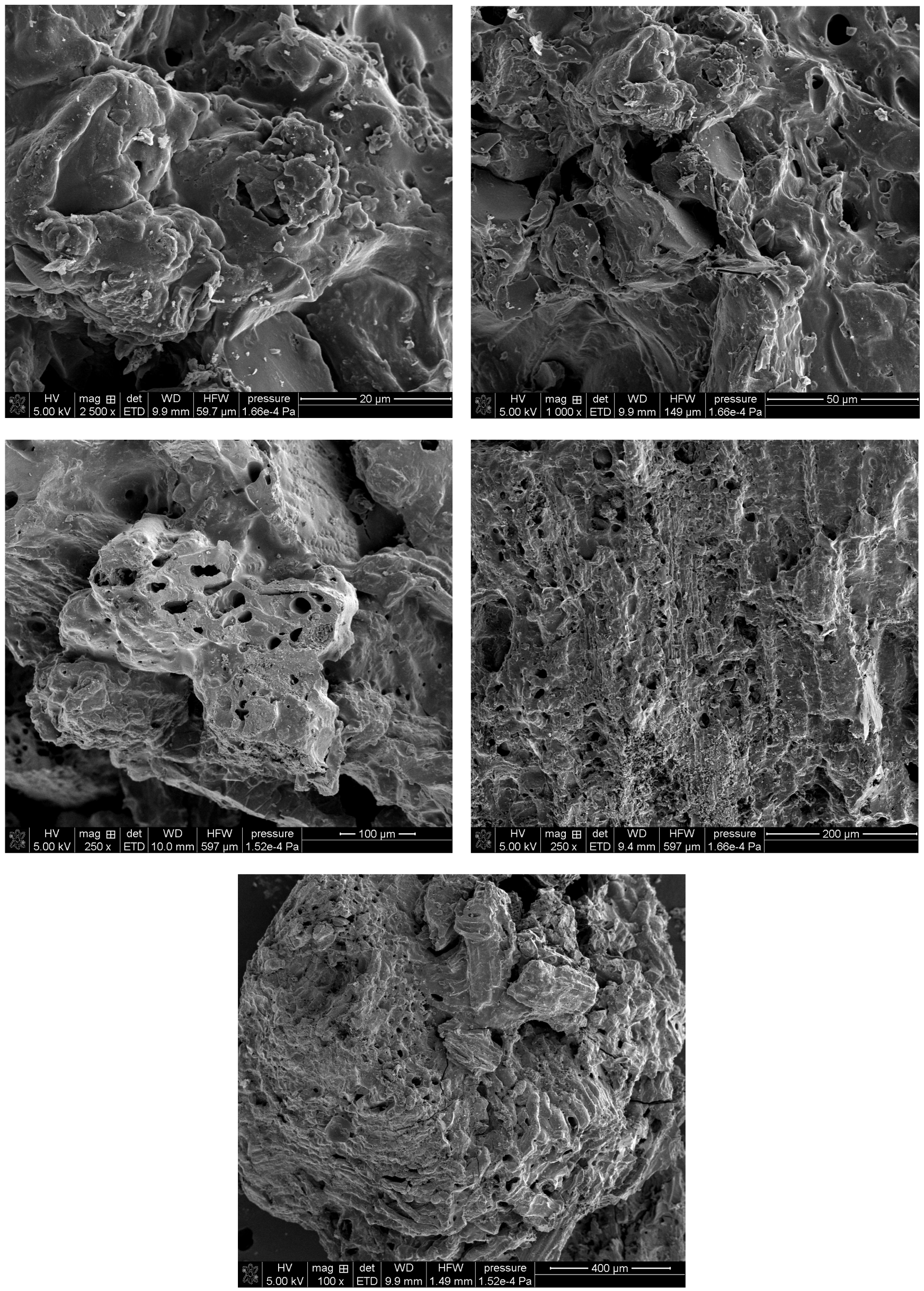 Figure 4 shows the SEM micrographs of the C-SC activated carbon, which exhibits a markedly different morphology. The material appears to have a slightly layered structure, a heterogeneous surface with numerous micropores and cracks. The sample’s appearance may suggest a directional structure. The observed differences underscore the critical role of precursor selection in tuning the morphological properties of activated carbons.