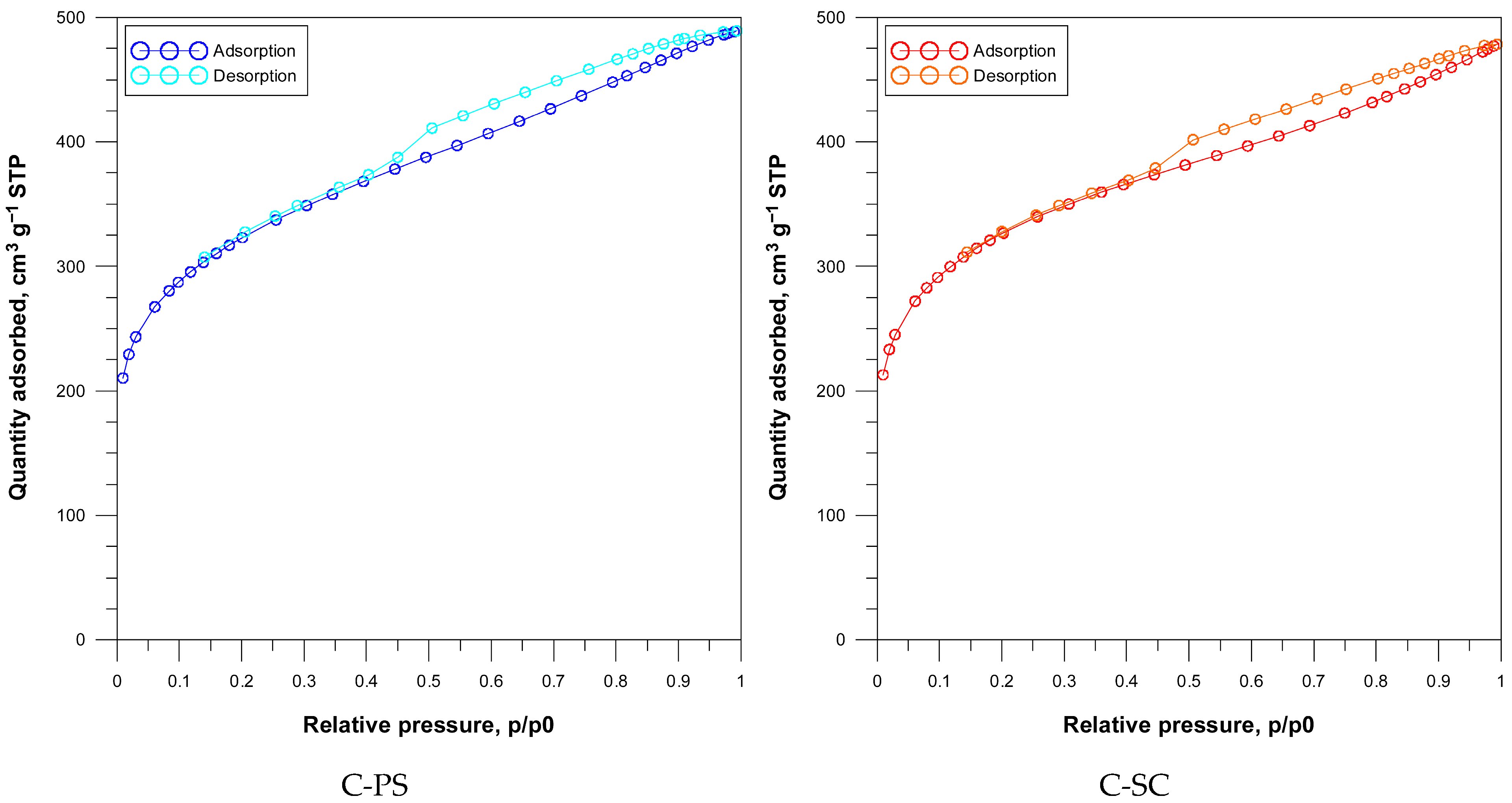 According to the IUPAC recommendation, the nitrogen adsorption–desorption isotherms of both carbons were assigned to Type IV with H4-type hysteresis loops, indicating the micro-mesoporous materials [