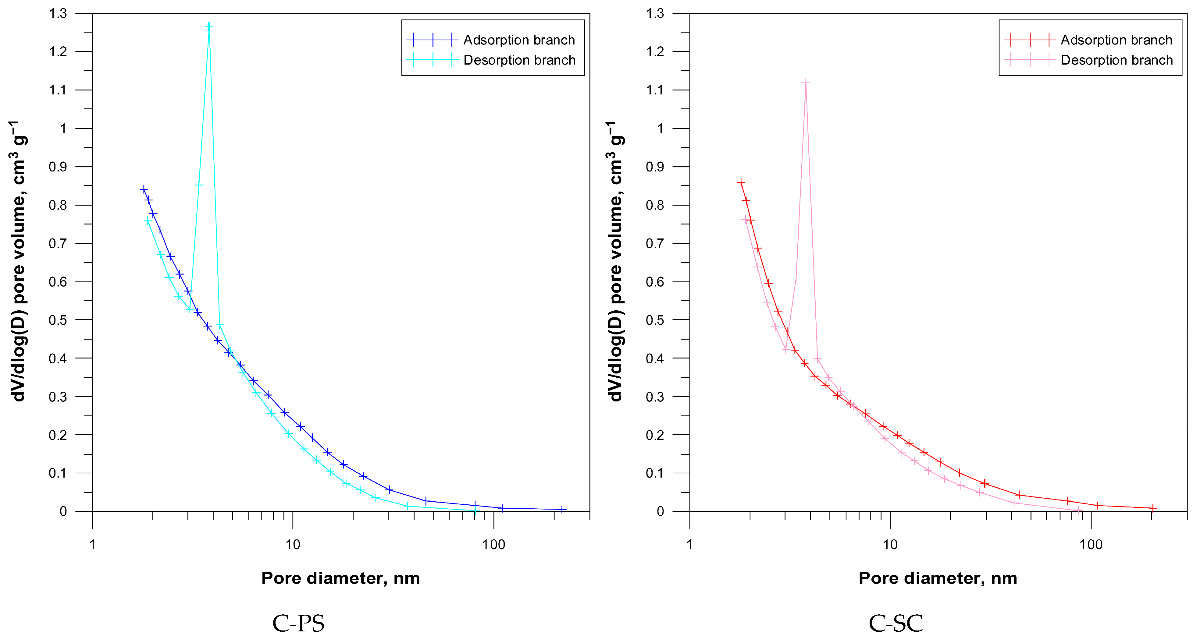 Figure 6). It is worth noting that the pore size distributions derived from the adsorption and desorption branches differ significantly. Some variations are also observed between the carbon types, reflecting their different pore structures.