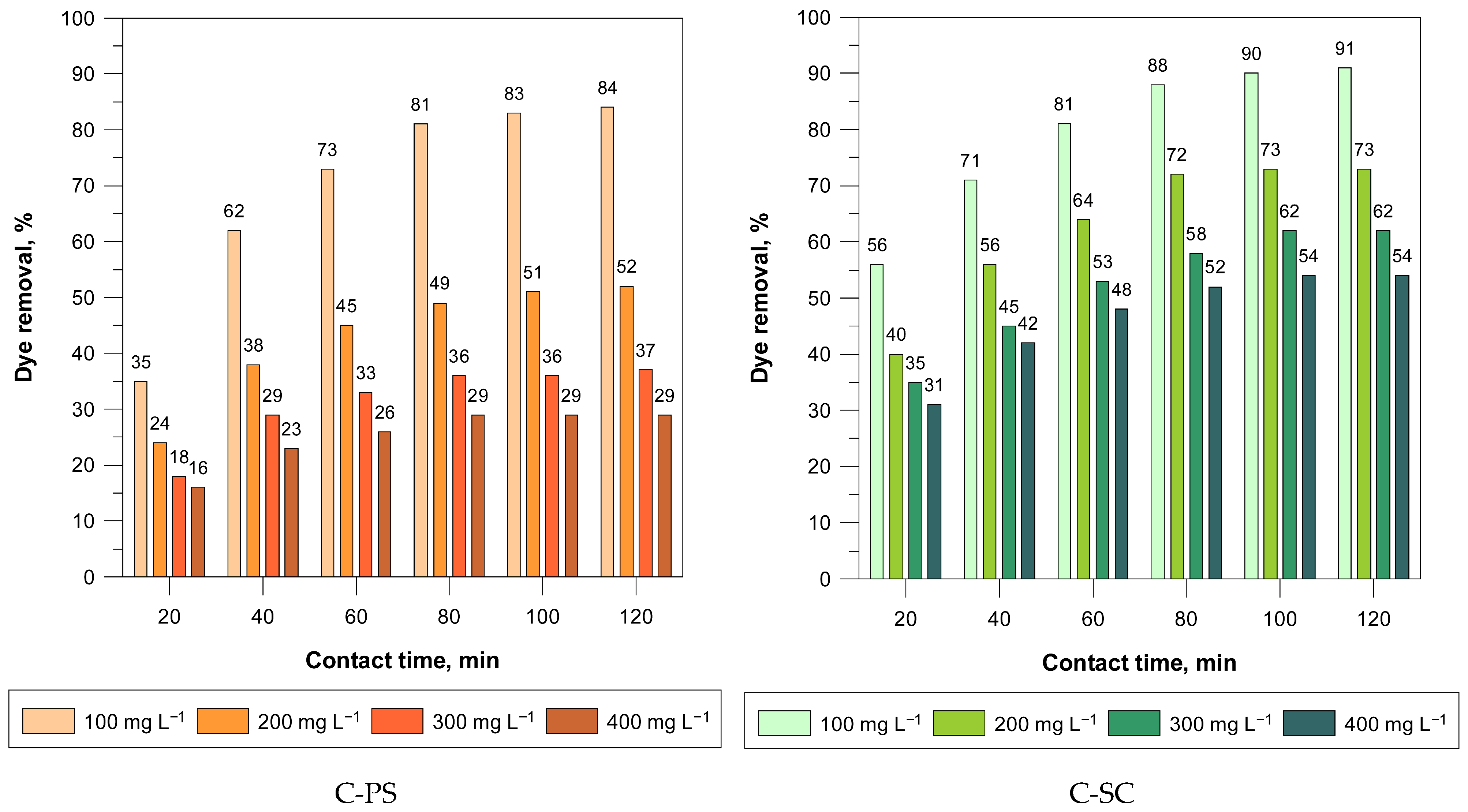 For both C-PS and C-SC, dye removal increased with longer contact times, indicating that the adsorption process is time-dependent and likely controlled initially by surface adsorption followed by slower pore diffusion. C-PS showed a steady rise in removal efficiency over time, reaching a maximum of 84% at 120 min for the 100 mg L−1 solution. In contrast, C-SC removal efficiency increased rapidly up to 90% and then plateaued, indicating a faster equilibrium.