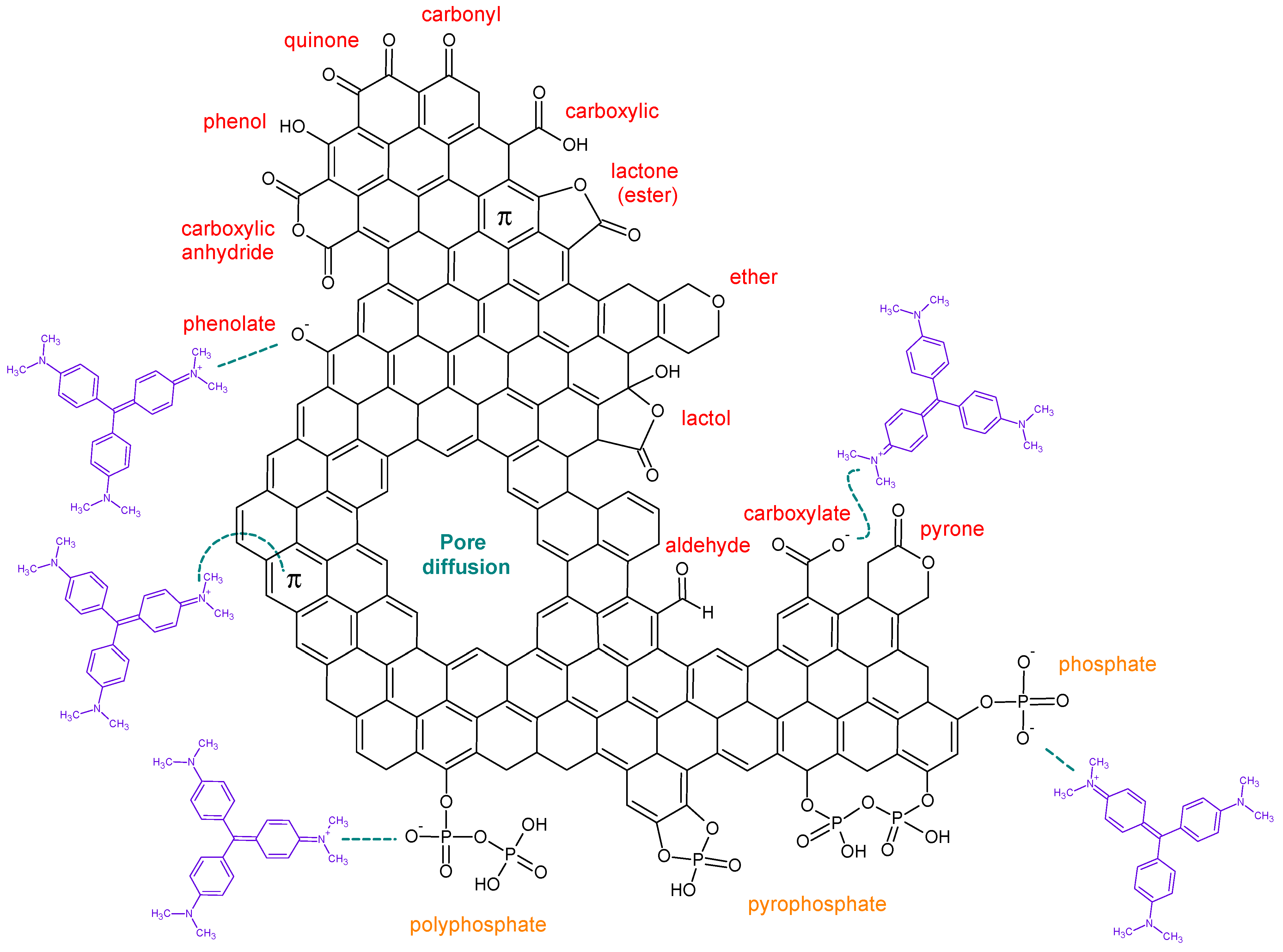 Table 3). These analyses provide critical insights into the types and distribution of oxygenated groups and the heteroatom doping (mainly phosphorus) that influence adsorption performance, particularly in dye removal.
