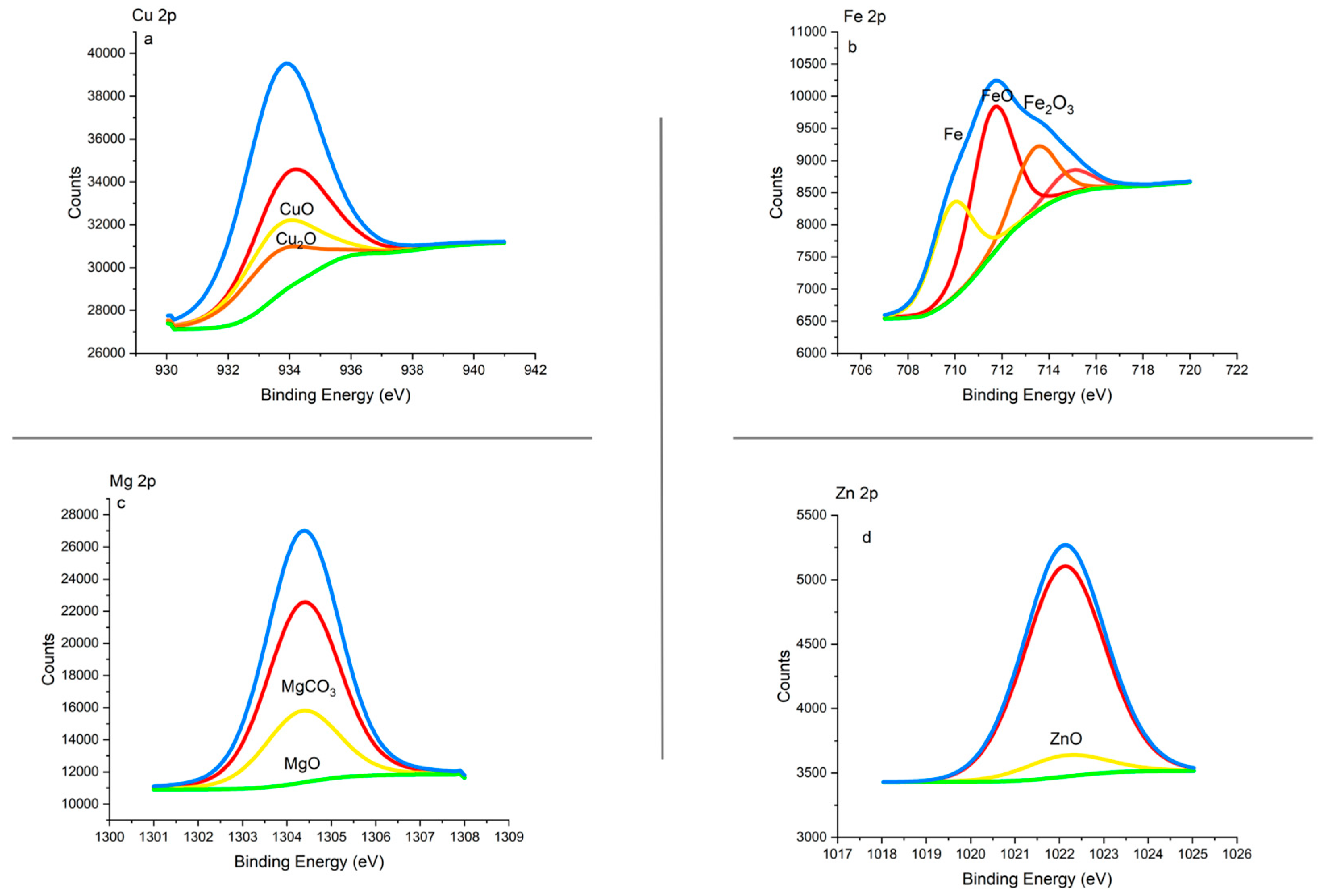 - Grosvenor, A.P.; Kobe, B.A.; Biesinger, M.C.; McIntyre, N.S. Investigation of multiplet splitting of Fe 2P XPS spectra and bonding in Iron Compounds. Surf. Interface Anal. 2004, 36, 1564–1574. [Google Scholar] [CrossRef]