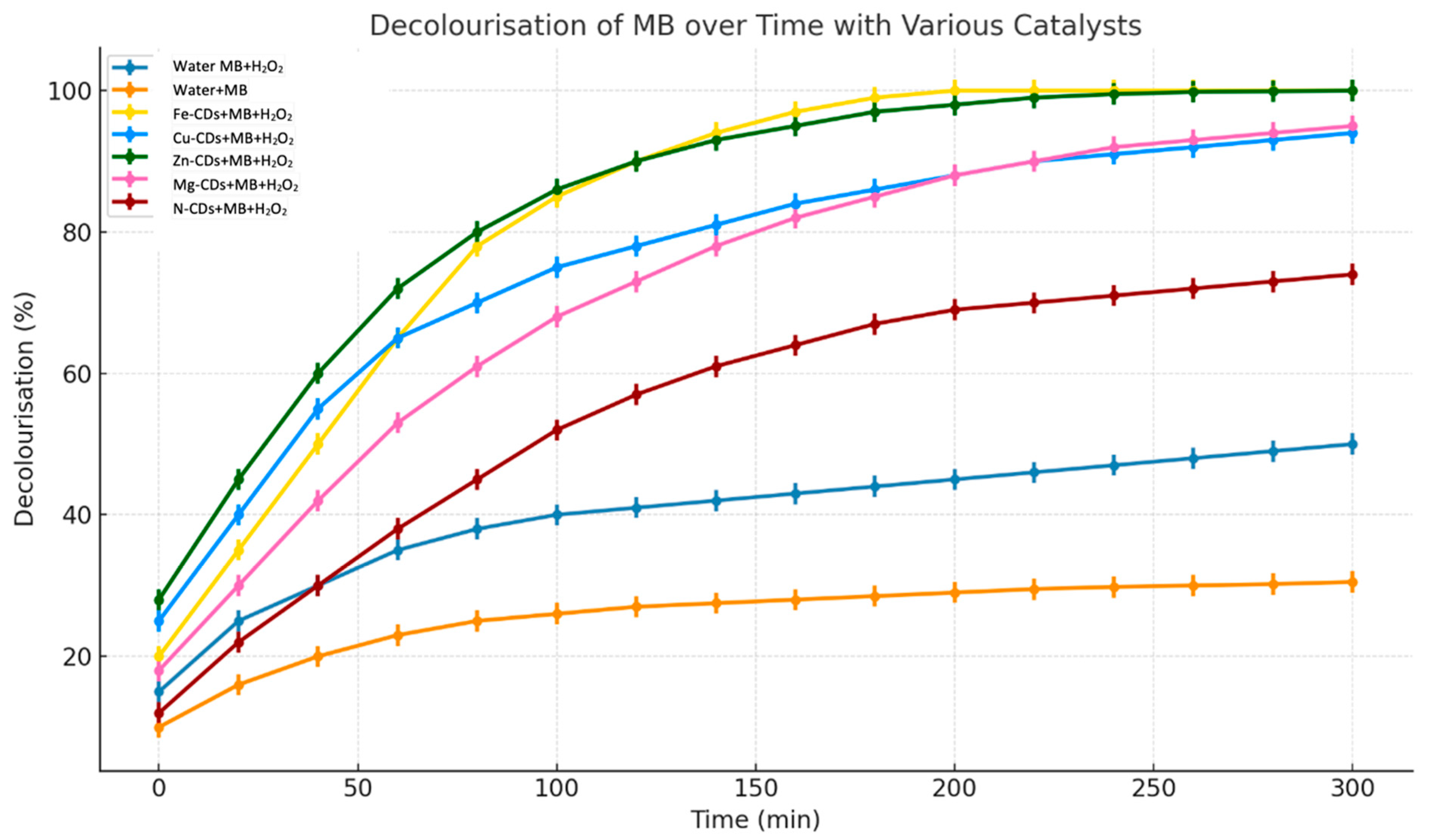 APA StyleChen, W., Cole, I., Ball, A. S., & Yin, H. (2025). Metal-Doped Carbon Dots as Heterogeneous Fenton Catalysts for the Decolourisation of Dyes—Activity Relationships and Mechanistic Insights. C, 11(4), 87. https://doi.org/10.3390/c11040087