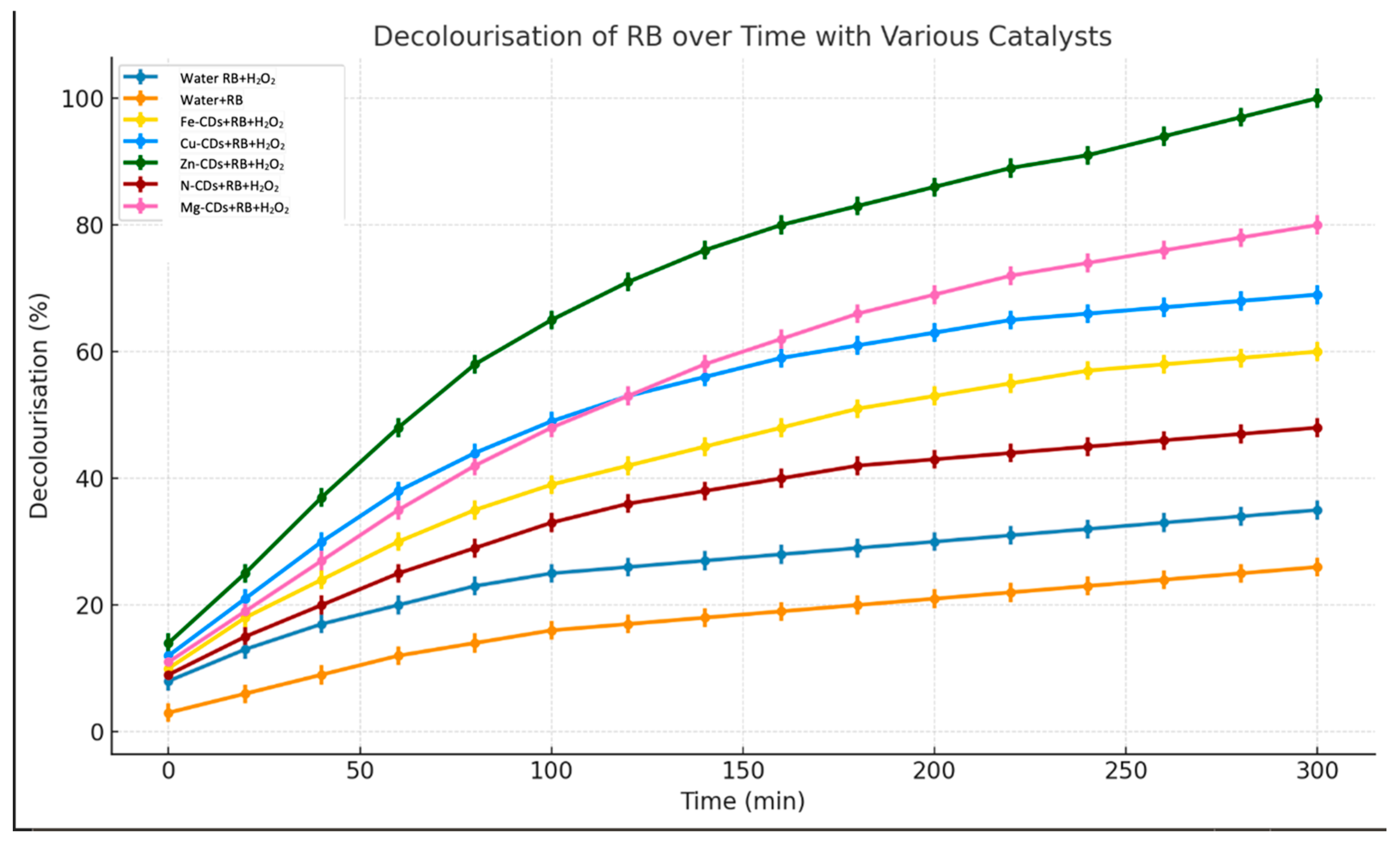 | Zn-doped CDs | RB | 6.8 | 50 | 100% in 300 min | 0.0106 | Low-cost, scalable | This work– |