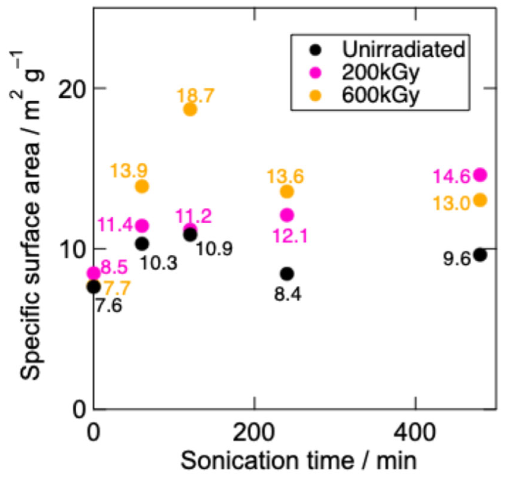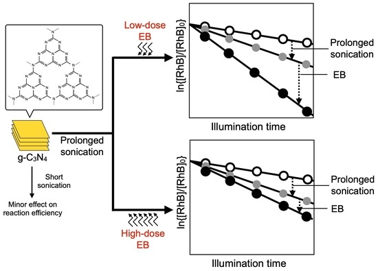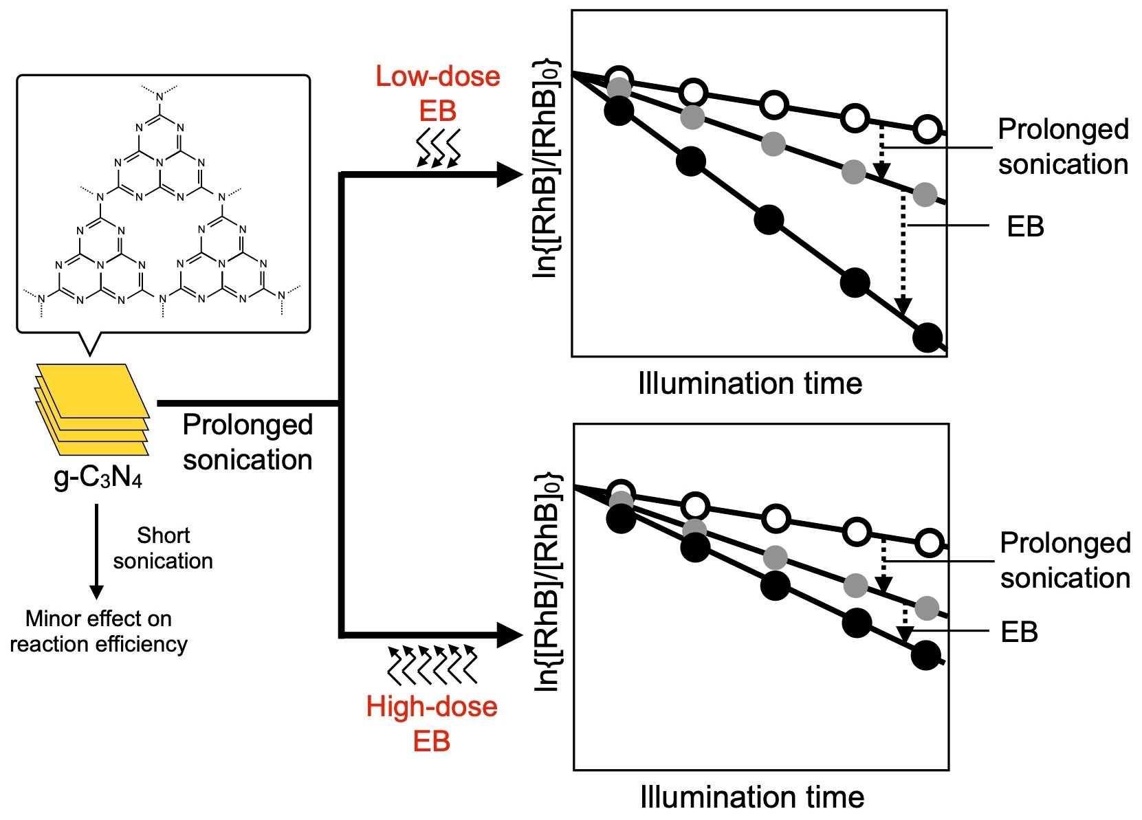 - Low-dose EB irradiation further improves the reaction efficiency of sonicated g-C3N4, as it does that of g-C3N4 that is not sonicated.