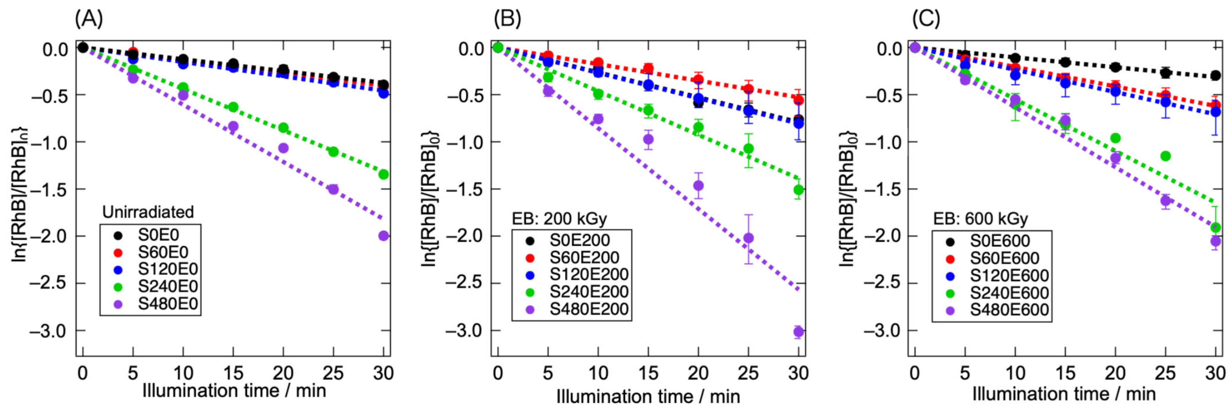 - Higher-dose EB irradiation did not markedly increase the reaction efficiency compared to that of unirradiated g-C3N4 despite its larger specific surface area.