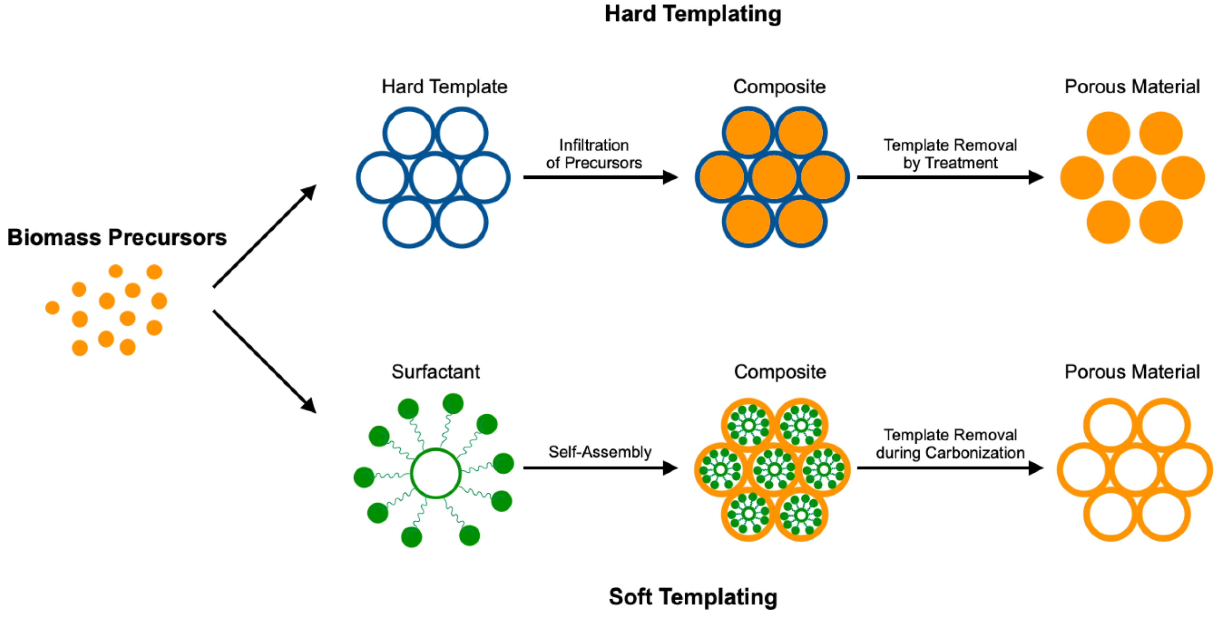 | Dual Templating | Combination of inorganic hard template and organic soft template | SiO2 + CTAB, MgO + P123, etc. | Hard template provides structural support, while soft template regulates micro/mesopores through combined confinement and self-assembly effects | Tunable hierarchical porosity, large surface area, improved pore connectivity and mass transfer | [205] |