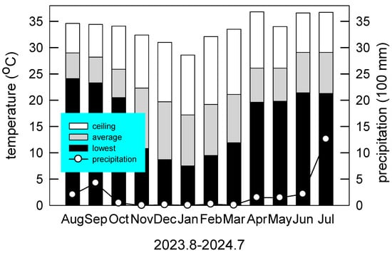 Monthly air temperatures (bar) and precipitation (circle) during the study period from August 2023 to July 2024 at Chiayi County, Taiwan (23°29′45.3″ N, 120°25′58.5″ E).