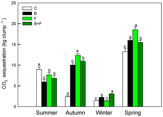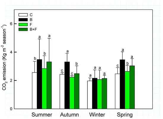 Seasonal variation of soil CO2 emission (Kg m−2 season−1) under different treatments (C = control, B = biochar, F = fertilizer, B + F = biochar + fertilizer). Error bars represent standard deviation. Different letters indicate significant differences (p < 0.05) in Tukey HSD analysis among the four field treatments (n = 12).