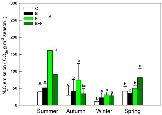 Seasonal N2O emission (CO2 e g m−2 season−1) under different treatments (C = control, B = biochar, F = fertilizer, B + F = biochar + fertilizer). Error bars represent standard deviation. Different letters indicate significant differences (p < 0.05) in Tukey HSD analysis among the four field treatments (n = 12).
