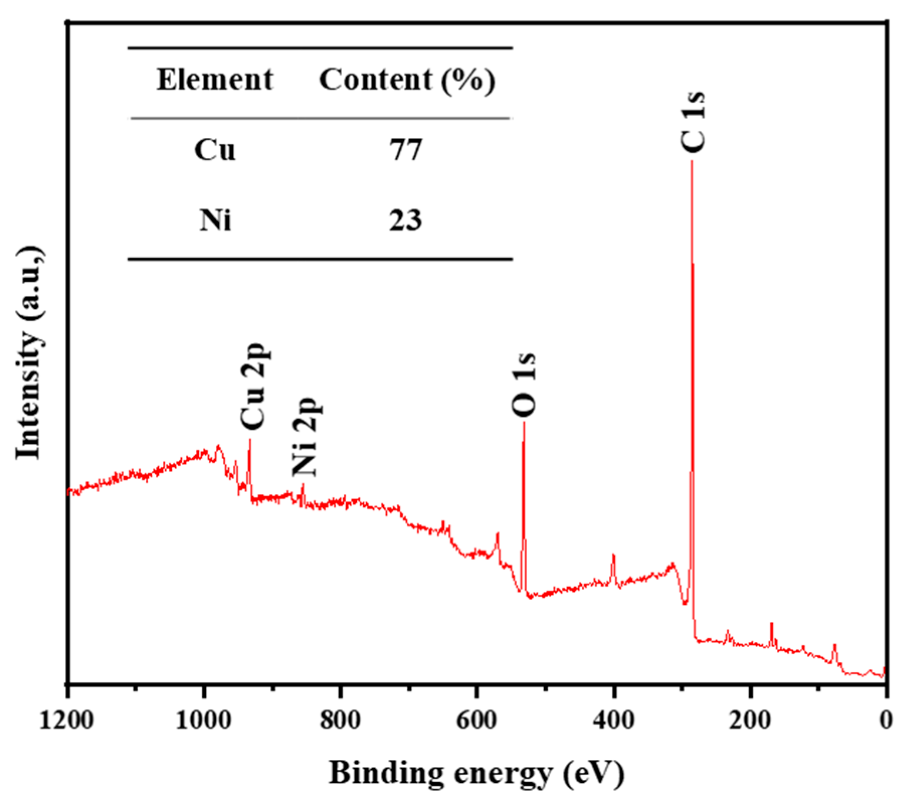 Figure 2. The XPS results indicate the presence of Cu, Ni, C, and O elements, and the atomic content of Cu is 77%, while that of Ni is 23%, which is basically similar to the composition of the Cu
