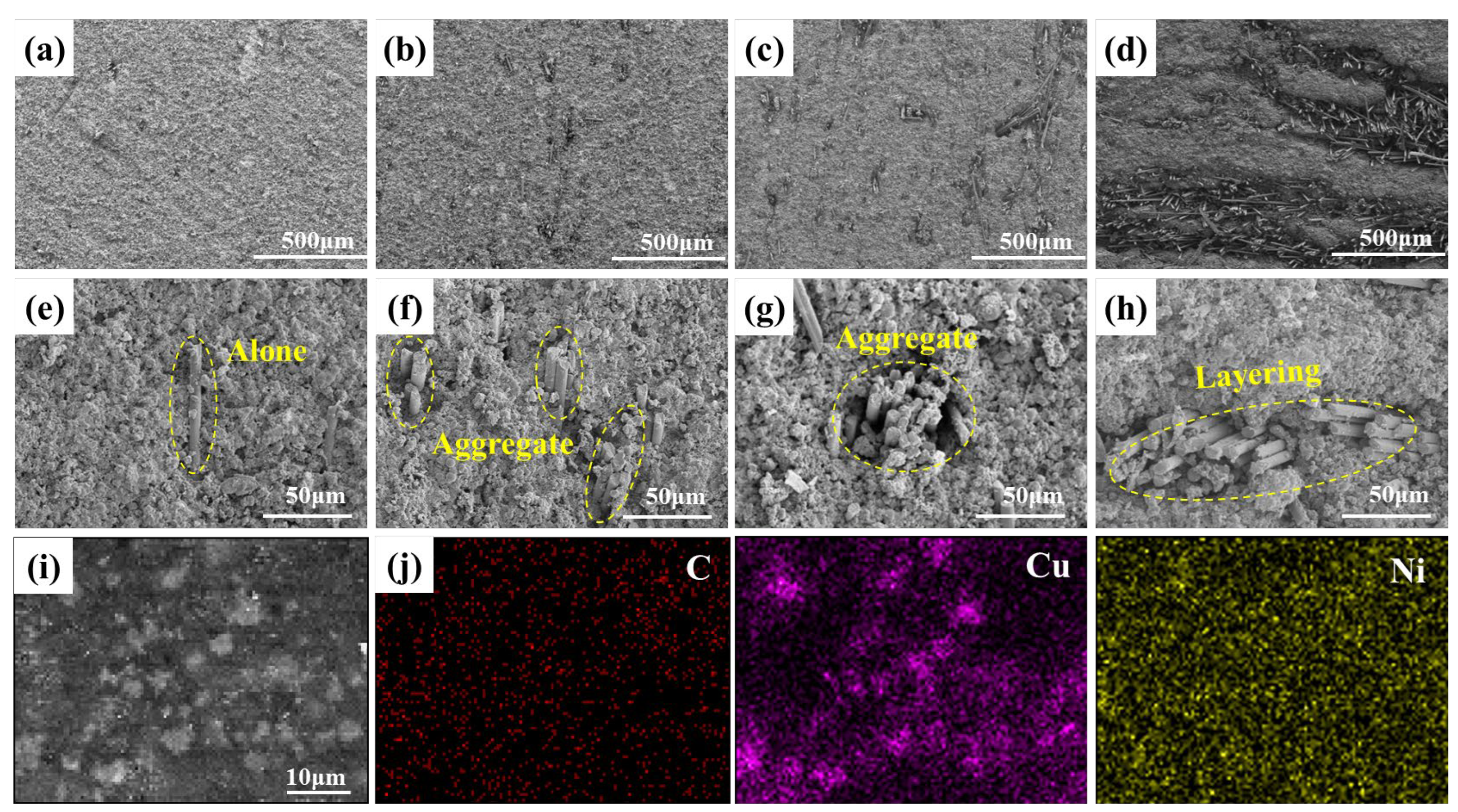 Figure 4d,h). The results show that with the increase in carbon fiber content, the distribution morphology of carbon fibers in the matrix undergoes an evolution process from single dispersion to agglomeration and then to layering, while the pores and structural defects in the matrix gradually intensify. This trend is consistent with the previous analysis results of apparent density. The EDS characterization results of the composites visually demonstrated the distribution of Cu, Ni, and C elements, as shown in