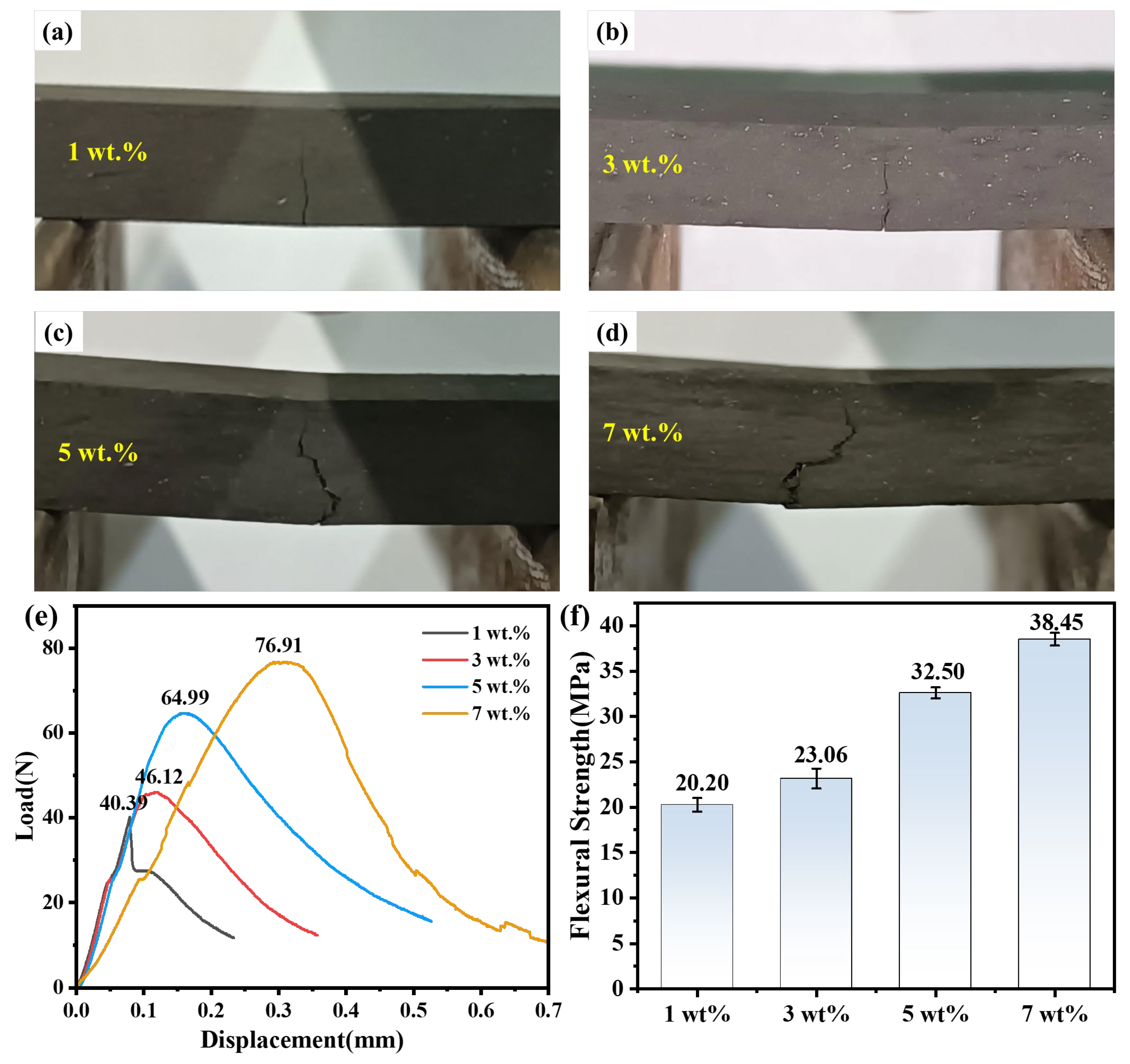 Figure 5e. Under the four carbon fiber contents, after the material reaches its maximum load-bearing capacity, the load shows a slow downward trend, demonstrating typical pseudo-plastic fracture characteristics. This behavior indicates that the carbon fibers effectively bear the load and absorb a large amount of energy in the matrix, exerting bridging and pull-out effects. With the increase in carbon fiber content, the maximum fracture loads of the materials are 40.39 N, 46.12 N, 64.99 N, and 76.91 N, respectively, indicating a significant positive influence of carbon fiber content on the material’s load-bearing capacity. Notably, the load–displacement curve of the sample with 7 wt.% carbon fiber content shows a stepwise decline at the end, suggesting that the crack undergoes multiple deflections and pinning during propagation, which corresponds to the layered and fiber agglomeration structures observed in the macroscopic fracture surface morphology. Bending strength reflects the material’s comprehensive resistance to deformation under a bending moment. With the increase in carbon fiber content, the bending strengths are 20.20 MPa, 23.06 MPa, 32.50 MPa, and 38.45 MPa, respectively (