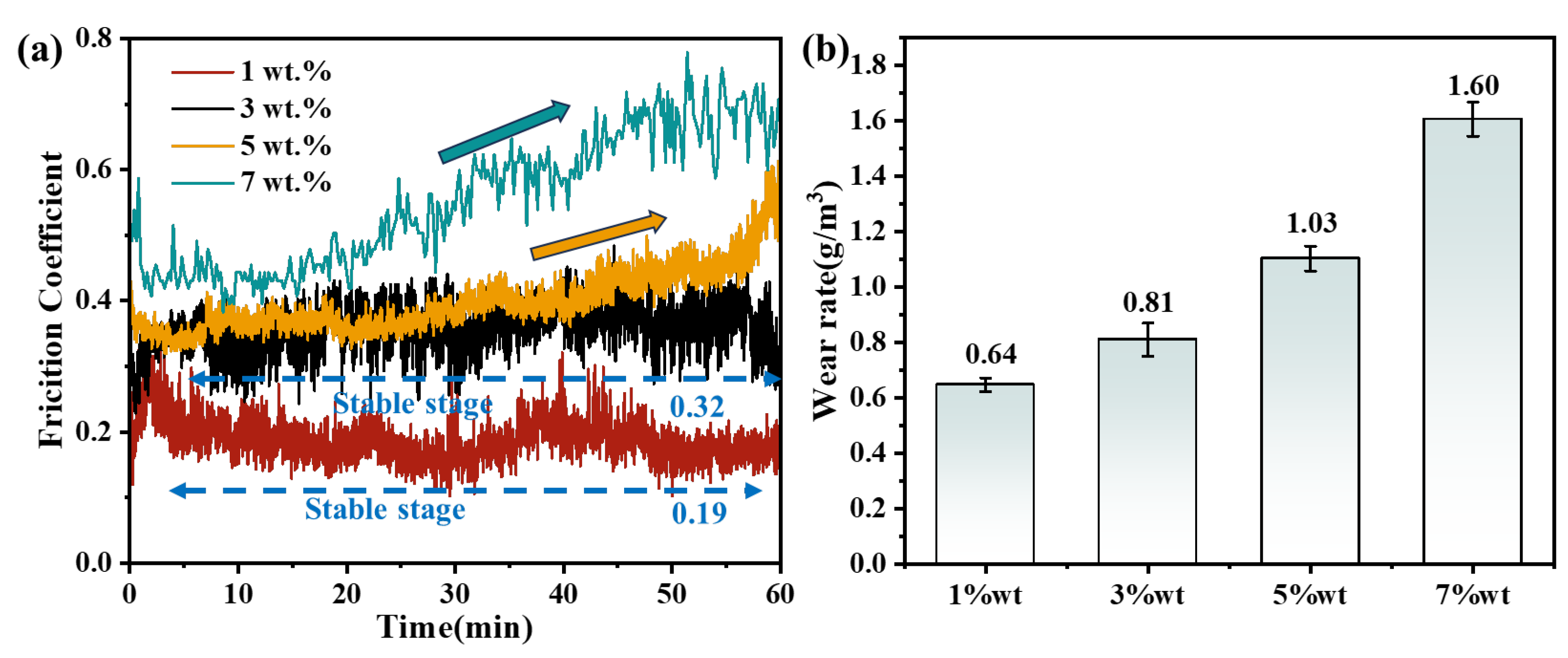 Figure 9b2,b3). When the carbon fiber content increases to 7 wt.%, the interwoven carbon fiber network causes large chunks of the matrix to peel off during friction, with a large number of carbon fibers exposed on the friction surface (