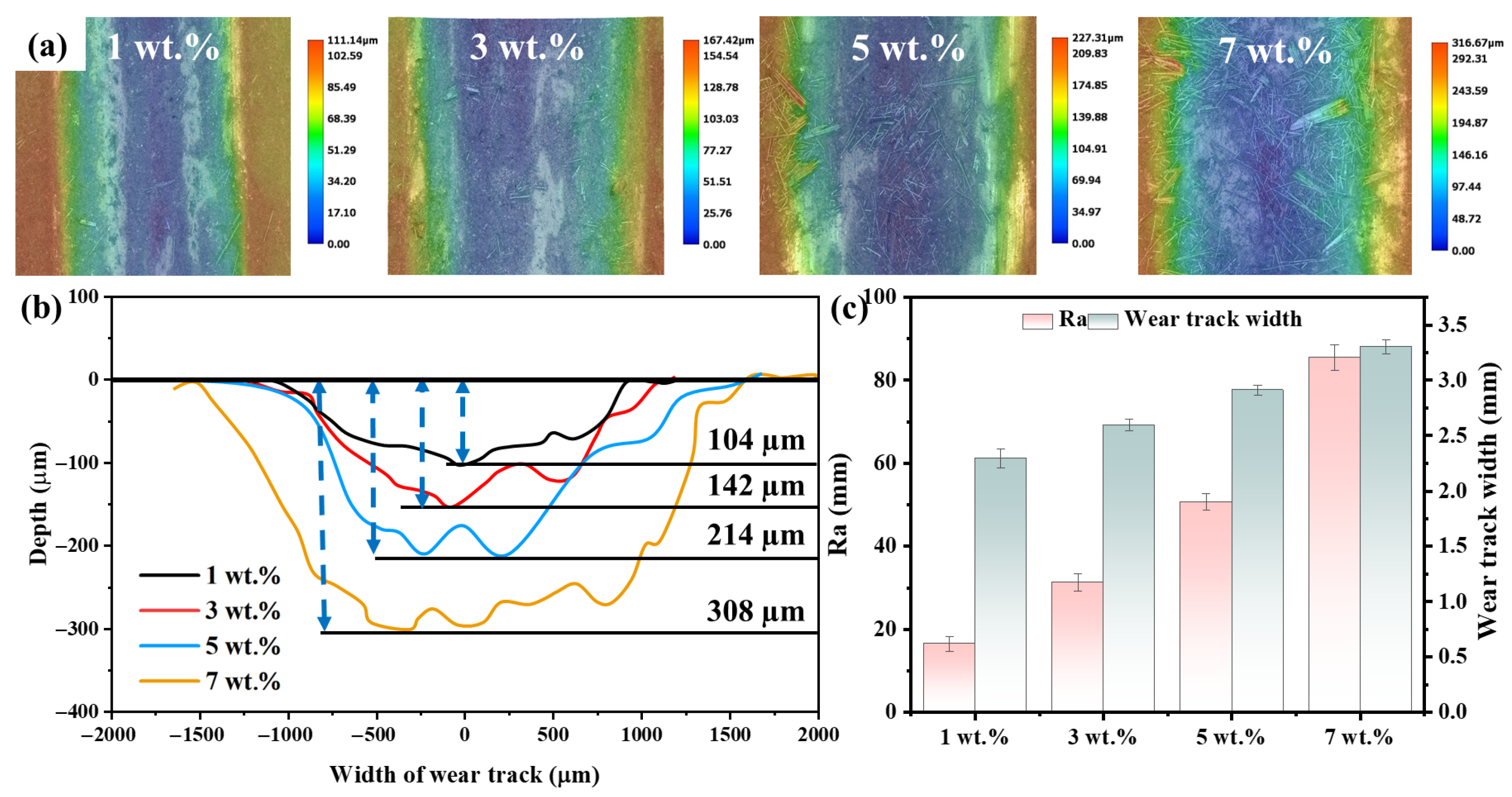 Figure 8c, there is a clear linear positive correlation between the surface roughness of the material and the width of the wear mark, further indicating that as the wear area expands, the surface unevenness intensifies. This result systematically confirms that with the increase in carbon fiber content, the wear behavior of the composites intensifies, the matrix damage becomes more severe, and the overall wear volume significantly increases, which is highly consistent with the aforementioned friction coefficient variation law and wear rate test results.