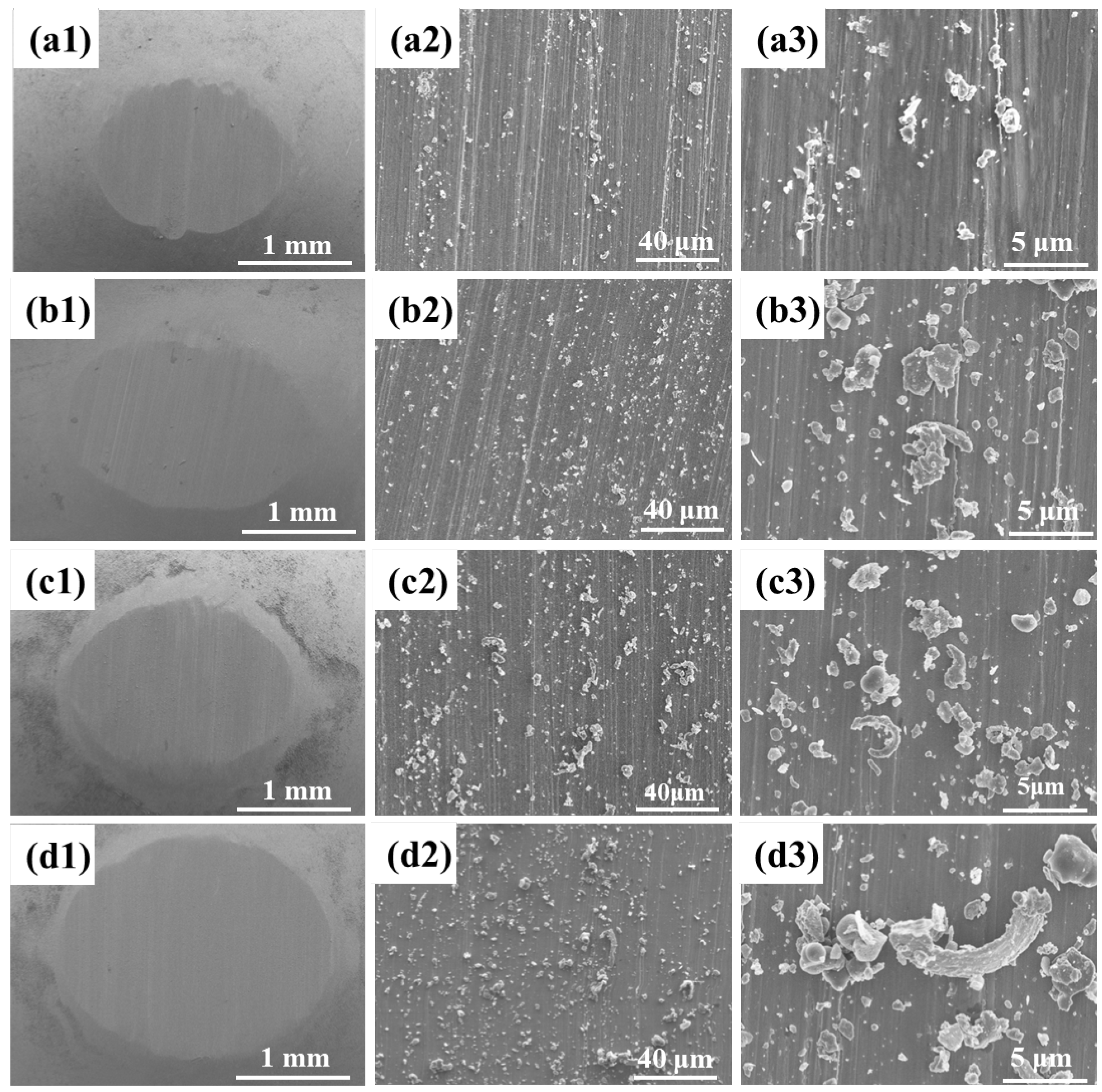 Figure 10a1–d1). Due to the mutual interaction in the friction process, the wear state of the counter balls corresponds to the wear degree of the composites, and the size of the wear debris particles adhering to their surface also increases (