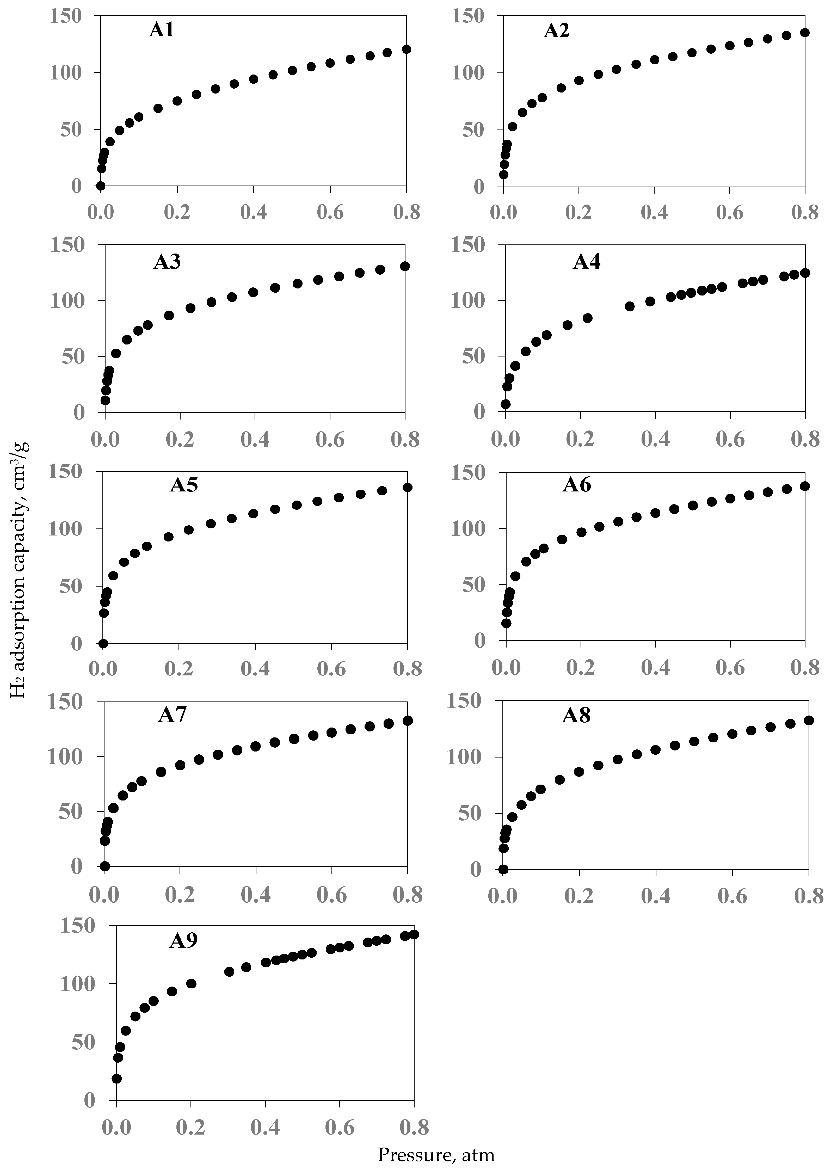 - Kopac, T.; Toprak, A. Hydrogen sorption characteristics of Zonguldak region coal activated by physical and chemical methods. Korean J. Chem. Eng. 2009, 26, 1700–1705. [Google Scholar] [CrossRef]