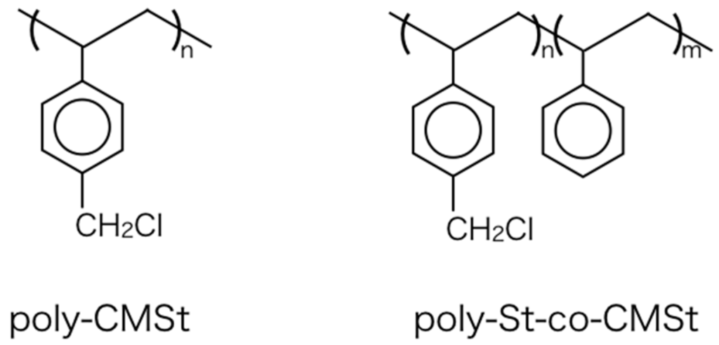 Poly(4-chloromethyl)styrene (poly-CMSt) was prepared by conventional radical polymerization of CMSt. CMSt and AIBN were mixed in THF and stirred for 24 h at 65 °C. The mixture was subsequently poured into methanol to precipitate the resultant polymer, which was then vacuum-dried at room temperature.