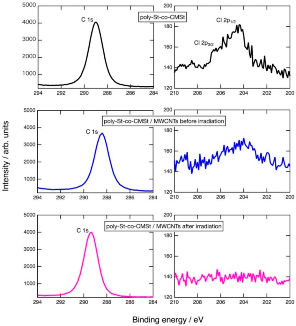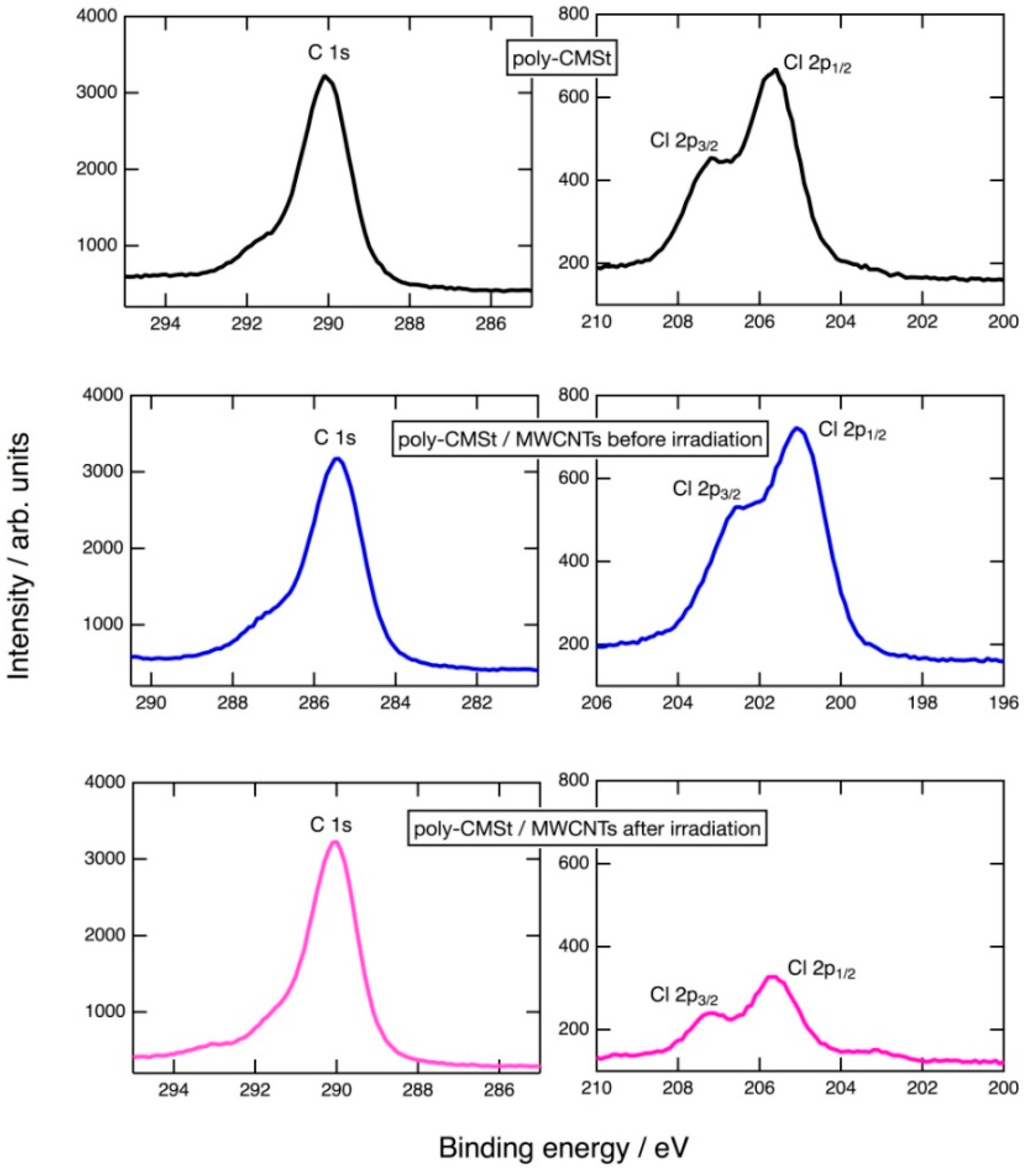 Figure 2 shows the X-ray photoelectron spectra (C 1s and Cl 2p) of the poly-CMSt/MWCNT mixture before and after ultraviolet (UV) irradiation for 24 h. The spectra recorded for neat poly-CMSt are also shown. Transverse shifts of the spectra, probably induced by charge-up of the samples, were observed. However, as the transverse shifts did not quantifiably affect C and Cl, no manipulation (numerical correction) of the shifts was conducted here. The Cl content was found to significantly decrease during the irradiation, indicating that the C–Cl bonds of the polymer side chains were dissociated by photolysis. The separated Cl atoms escaped from the poly-CMSt/MWCNT mixture; if Cl trapping in the polymer and Cl adsorption on the MWCNT surface had been dominant, the intensities of the Cl 2p spectra would have been similar. In the present case, the Cl atoms were probably released in the form of gaseous Cl2 generated through the recombination of Cl atoms. Conversely, the C content of the sample remained almost constant during the irradiation. The C content comprised the amounts of C from both the polymer and the MWCNTs in the sample. The polymer/MWCNT weight ratio of the sample was 25 mg/1.3 mg; therefore, the signal assigned to C in the polymer appeared as dominant in the spectra. These results indicated that the polymer did not decompose to form volatile compounds, and was durable against UV irradiation. These findings supported the selective dissociation of photo-induced C–Cl bonds of the polymer side chain.