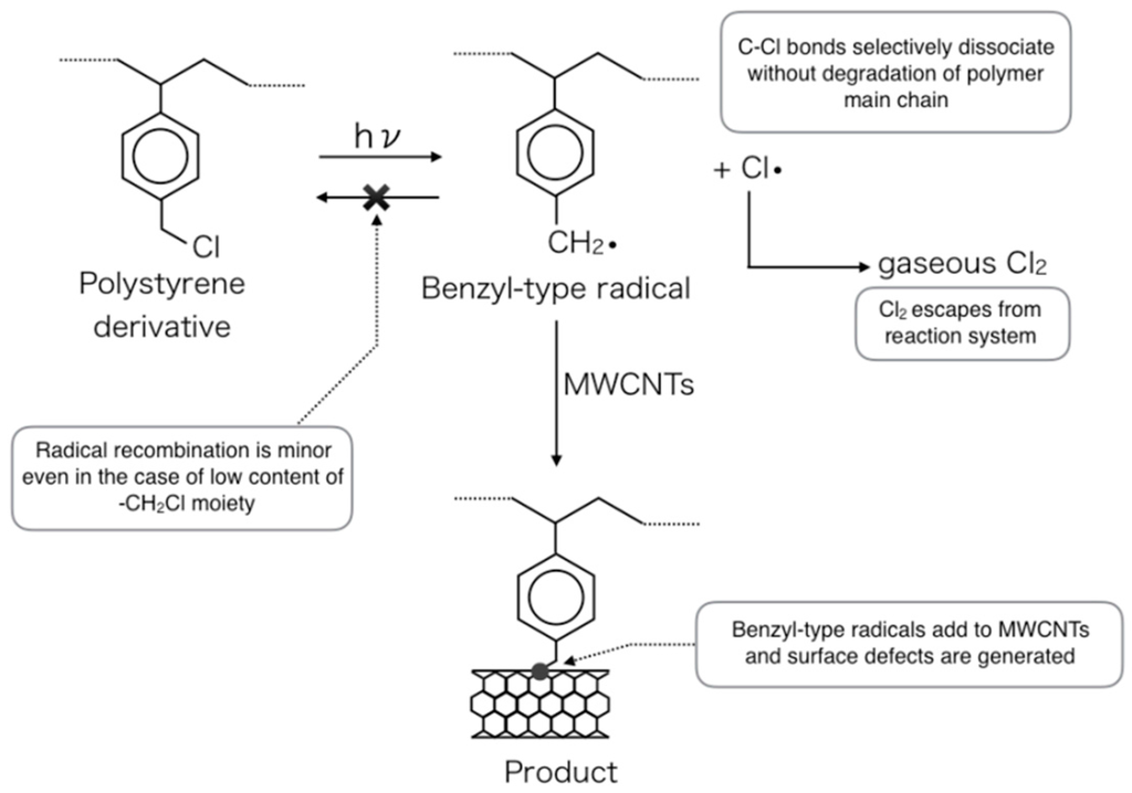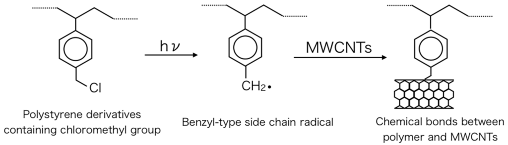 In this work, we examined the formation of a chemical bond between multi-walled CNTs (MWCNTs) and side chains of polystyrene. The chemical bonds were formed through the addition of benzyl-type radicals generated by the photo-induced dissociation of the C–Cl bond of the poly(p-chloromethyl)styrene side chain. Photo-induced formation of benzyl-type radicals from corresponding benzyl halides has already been reported [23]. Notably, various free radicals smoothly attack and bind to CNT surfaces [24,25,26,27]. The reaction process is shown in Scheme 1.