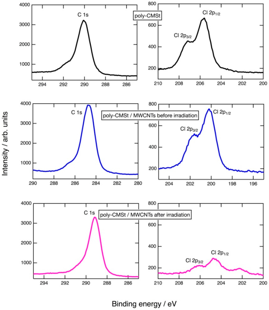 Figure 2. C 1s and Cl 2p X-ray photoelectron spectra observed for intact poly(p-chloromethyl)styrene (poly-CMSt) and for poly-CMSt/multi-walled carbon nanotube mixture before and after ultraviolet irradiation.