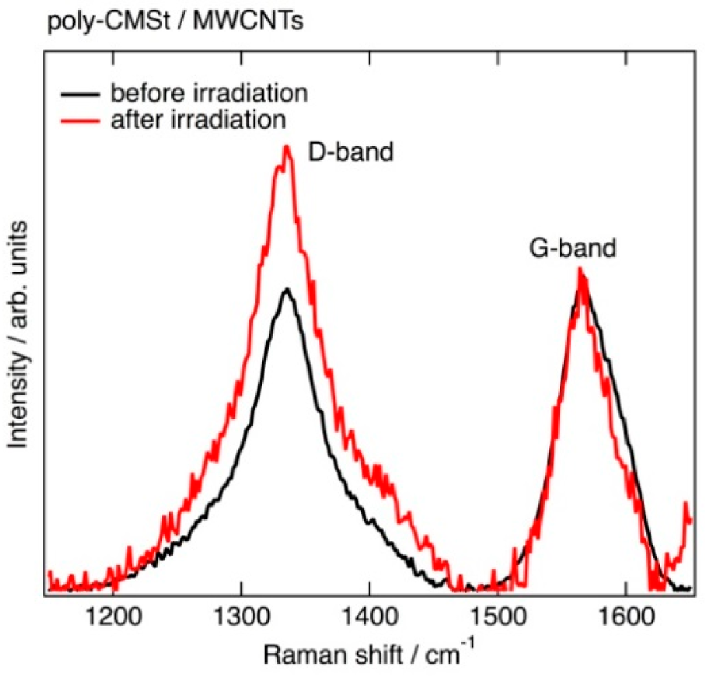 Figure 4 shows the Raman spectra of poly-CMSt/MWCNT and poly-St-co-CMSt/MWCNT mixtures before and after irradiation for 24 h. The intensities of the recorded signals were adjusted to equalize the intensities of the G bands observed before and after irradiation. In both cases, for poly-CMSt/MWCNT and poly-St-co-CMSt/MWCNT mixtures, two characteristic bands belonging to MWCNTs, i.e., the G and D bands, were visible. The G band observed at ~1570–1590 cm−1 was assigned to the in-plane vibration of the MWCNT aromatic rings; the D band observed at ~1310–1340 cm−1 originated from MWCNT defects generated by the deformation of the original sp2-based structure. The intensity ratio of the G to D bands, the G/D ratio, is an index of the degree of surface structural deformation induced by the chemical reaction [32]. We compared the G/D ratios of the samples before and after irradiation to observe the structural change in MWCNTs caused by the attack of the polymer side chain radicals.