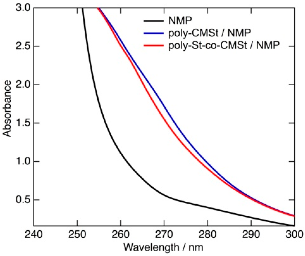 Poly-CMSt, or poly-St-co-CMSt, (25 mg) was dissolved in 2.5 cm3 of NMP; then 1.3 mg of MWCNTs was added. The mixture was subsequently irradiated with UV light using a Xenon light source (Asahi Spectra MAX-303, Asahi Spectra, Co. Ltd., Tokyo, Japan) for 24 h at room temperature. The wavelength of the irradiated UV light was in the range of 250–385 nm. Ultraviolet absorption spectra of NMP and polymer/NMP solutions are shown in Figure 9. In the wavelength region of 250–300 nm, the absorbance of the polymers was substantially larger than that of pure NMP. The absorbance in the longer wavelength region (>300 nm) approached zero.