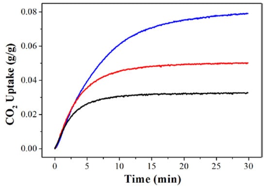 Plot of CO2 uptake for nitrogen- and sulfur-doped porous carbon (NSPC) as a function of time using pure CO2 at 1 atm at the temperatures of 24.5, 44.7, and 65.0 °C in blue, red, and black, respectively.