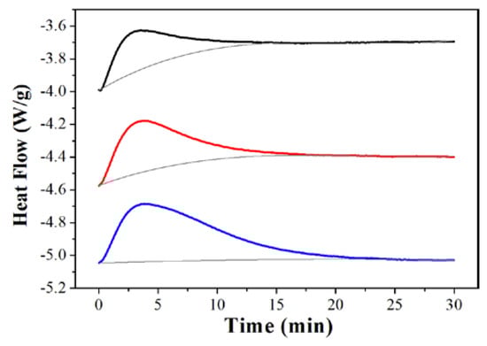 Plot of heat of flow for the adsorption of CO2 on NSPC as a function of time using pure CO2 at 1 atm at the temperatures of 24.5, 44.7, and 65.0 °C in blue, red, and black, respectively. The baselines in gray were used to integrate the curves and calculate the corresponding integrate molar heat of adsorption at each temperature. The corresponding CO2 uptake curves are given in Figure 1.