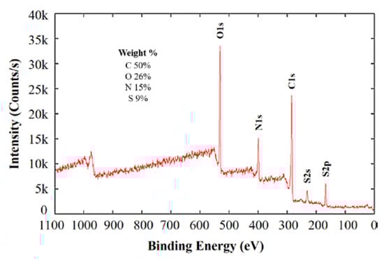 Chemisorption is the dominant mechanism of CO2 capture based on the integrated values of molar heat of adsorption, thus there should be significant suitable functional groups present on the NSPC foam. X-ray photoelectron spectroscopy (XPS) analysis of NSPC foam confirms the presence of significant nitrogen (15 wt%) and sulfur (9 wt%) as well as oxygen (23 wt%), as shown in Figure 3. Based upon our prior work [], it would be expected that the carbon content (50 wt%) should result in a PC with low CO2 uptake, since maximum CO2 uptake is achieved for pyrolyzed PC having a surface area ≥2800 m2/g, a pore volume ≥1.35 cm3/g, and a C content between 80 and 95 wt% []. However, the NSPC foams compare favorably to NPCs prepared from the pyrolysis of polypyrrole (PPy) at 500–800 °C using a KOH:PPy weight ratio of 2. In fact, the CO2 uptake of such pyrolyzed NPCs is in the range of 1.5–2.5 mmol/g at 24 °C and 1 bar single component CO2 [], comparable to the 1.79 mmol/g of the present NSPC. This is further evidence of the different mechanisms of adsorption between KOH-activated NPC or SPC porous carbons and H2SO4-expanded NSPCs, hence the high CO2 uptake of the latter despite the limited amount of carbon present in the sorbent.