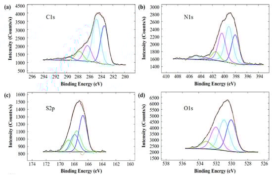 High resolution XPS spectra and corresponding deconvolution peaks for (a) C1s; (b) N1s; (c) S2p; and (d) O1s of NSPC foam. Deconvolution peaks are showed in color underneath experimental signals in black.