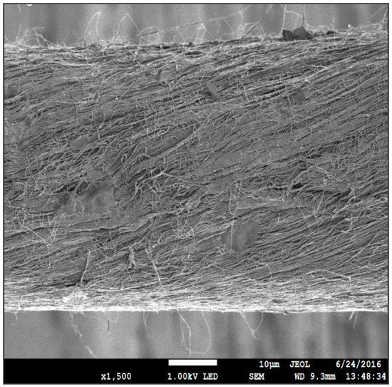 Carbon nanotubes could be single-walled (SWCNT) or multi-walled (MWCNTs) and synthesized by several methods [4]. CNT yarns are composed of many carbon nanotubes produced mostly in four methods: spinning from CNT forest initially grown on a substrate; spinning directly from a CNT aerogel formed from Chemical Vapor Deposition (CVD) process; spinning from a polymer solution containing polyvinylalcohol (PVA); and spinning from CNT films [4,5,6,7,8,9]. In order to increase compaction within the yarns or the van der Waals forces between individual CNTs, a post-treatment process is required by adding a solvent and evaporating it. Fabrication plays a vital role not only in the quality of the CNT yarns, but also on their properties. Among these four methods, the most popular one is the spinning from a CNT forest. Therefore, the CNT yarns used in this study are formed by this method, which consists of two primary stages: forming a CNT forest on a silicon wafer by CVD reaction and drawing the CNT yarns from it. Long continuous MWCNTs are drawn out and twisted from the CNT forest to form the yarn [4]. The twist naturally produces turns and angles. In general, the higher the angle and the number of turns, the higher the density of the CNT yarns [4]. However, optimization is required because the tensile strength reaches a maximum at a certain value of twisting density and then it decreases [10]. Figure 1 shows an image of the twisted CNT yarn obtained by Scanning Electron Microscope (SEM). After fabrication, the CNT yarn was wound around a spool for storing and handling purposes.