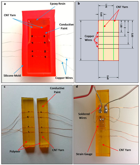 Optical images: (a) Silicone rubber mold and CNT yarns bonded to the wires with conductive paint prior to pouring the polymer; (b) Schematic of the sample with dimensions in cm; (c) Fabricated samples with instrumented wires; (d) Sample with strain gauge mounted on it.